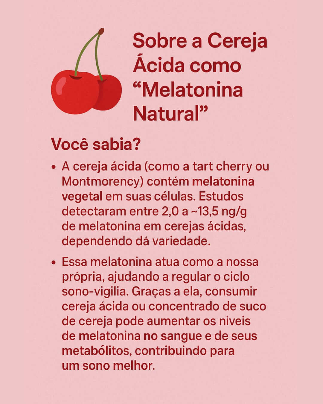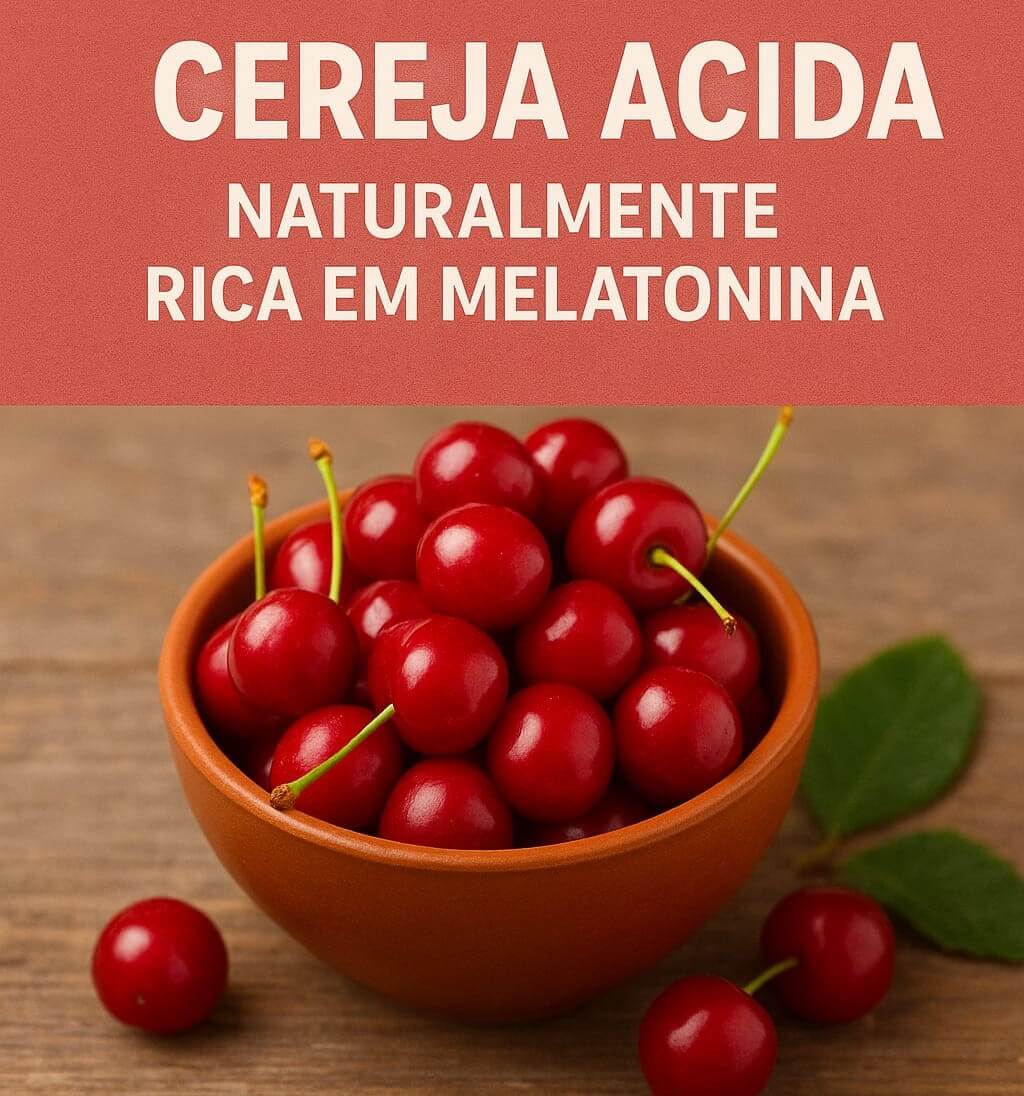 A cereja ácida (sour cherry) é uma das frutas com alto conteúdo natural de melatonina. Estudos demonstram que variedades como a Montmorency elevam os níveis circulantes de melatonina e melhoram indicadores de sono-qualidade.